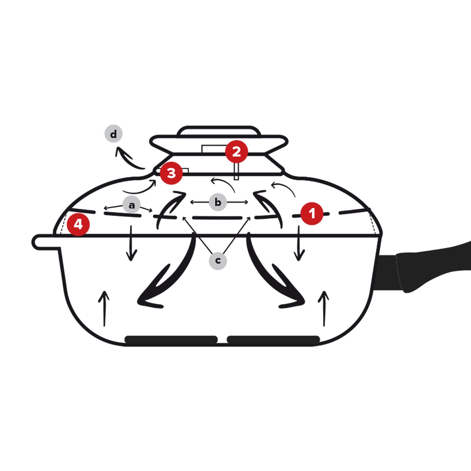 Der PIDI flott® Heißluftbratdeckel bringt ein durchdachtes Plus: Kondenswasser gelangt nicht zurück ins Gargut, sondern verdampft kontrolliert. Das verkürzt die Garzeit, schont Nährstoffe und intensiviert den Geschmack.